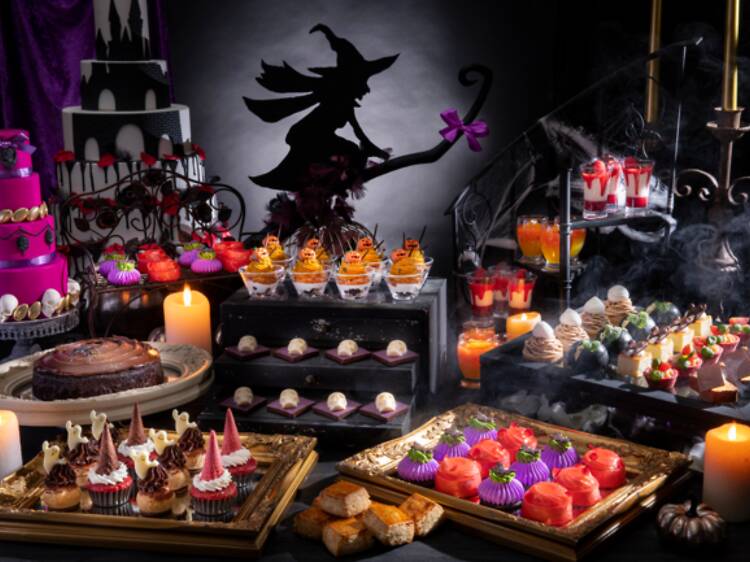 The array of Halloween-themed items on the menu include mini cheesecakes decorated with black cats, velvet cupcakes topped with pointed witch hats, and a decadent pumpkin Mont Blanc. Don't miss the truffle egg sandwiches made with black charcoal bread and the pumpkin gnocchi served with mushroom ragout.