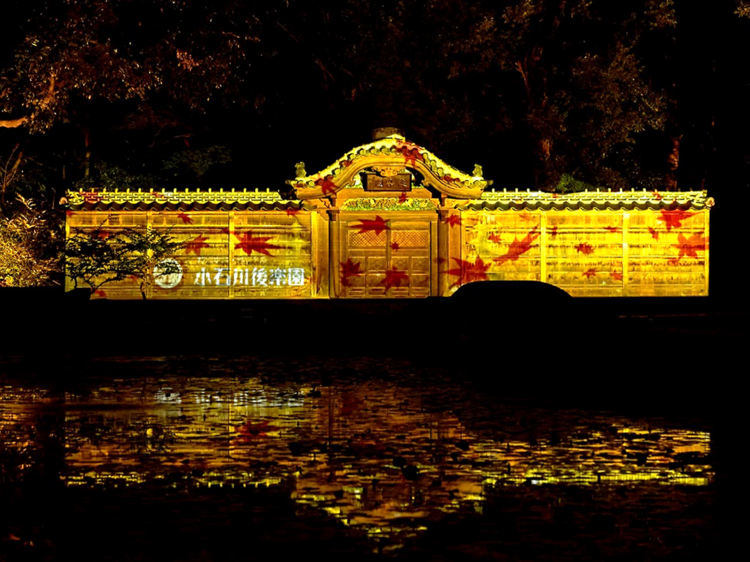 Come nightfall, several areas of Koishikawa Korakuen (not to be confused with the nearby Koishikawa Botanical Gardens) will be illuminated, including the artificial, forested Horai island on the main pond, the iconic Ipponmatsu pine tree, Engetsukyo bridge and many more. The highlight, however, is the projection mapping show at the Karamon Gate, the former main entrance into the inner courtyard of the Tokugawa family’s residence. The gate is a meticulously reconstructed structure built using Edo-period (1603–1868) architectural techniques, and the projection mapping display will showcase ukiyo-e and doro-e artworks depicting the vibrant lives of the same period.