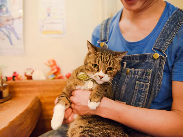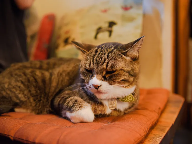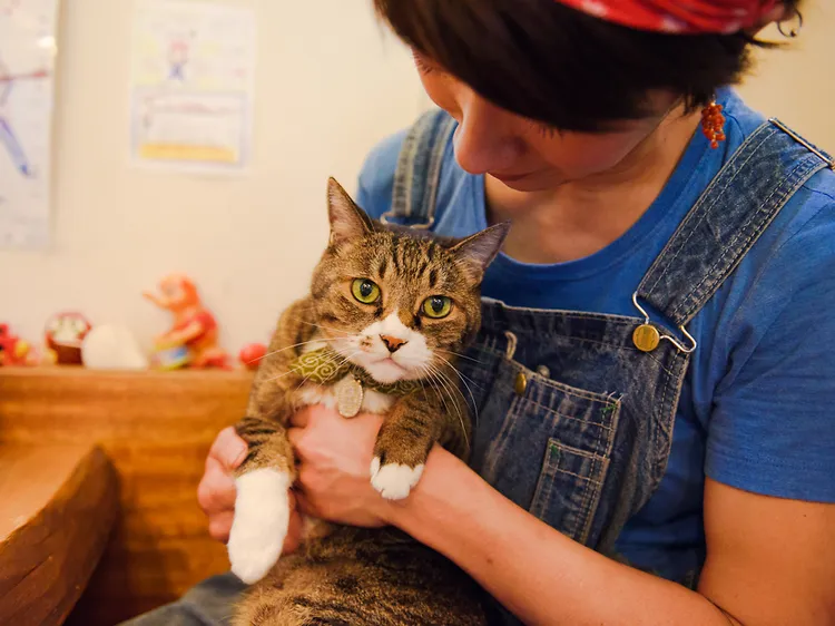 Opening the narrow door, we immediately discovered a cat sleeping on a seat in the very back. This is the girl we came for: new staffer Em. She's been inseparable from her owner since she was born, and the two have been living together for over 15 years now.
