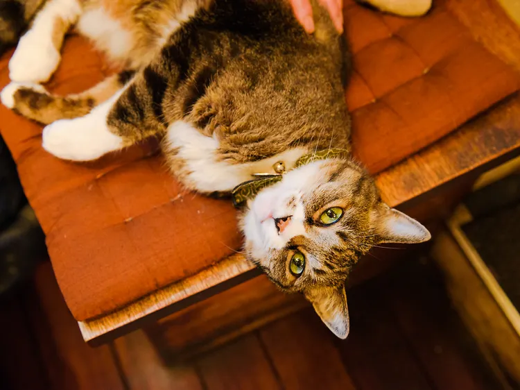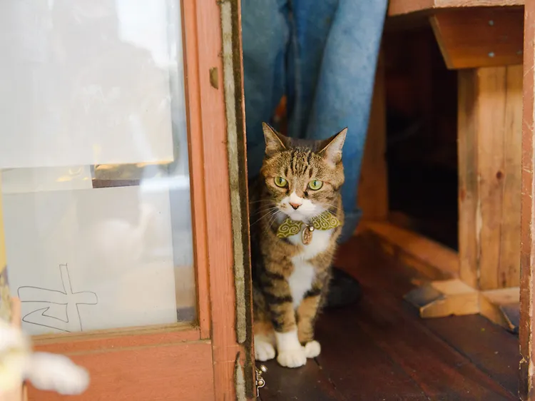 When you look at her and the owner side by side, it's easy to notice their strong levels of trust and camaderie, all in tune in order to attract unsuspecting passers-by into their comfy eatery. Be sure to pop by and spot Em faking her nap while on duty, but do keep your guard up – many have already fallen for her feline charms...