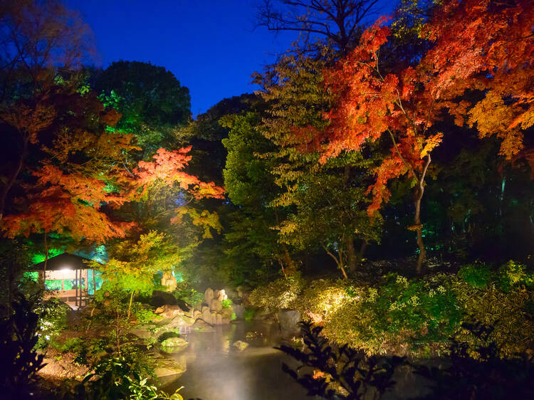 From November 28 to December 9, Rikugien stays open until 8.30pm for its annual light-up. The trees in the garden are bathed in golden lights so that the brilliant colours of the changing leaves stand out even more, providing stunning views.