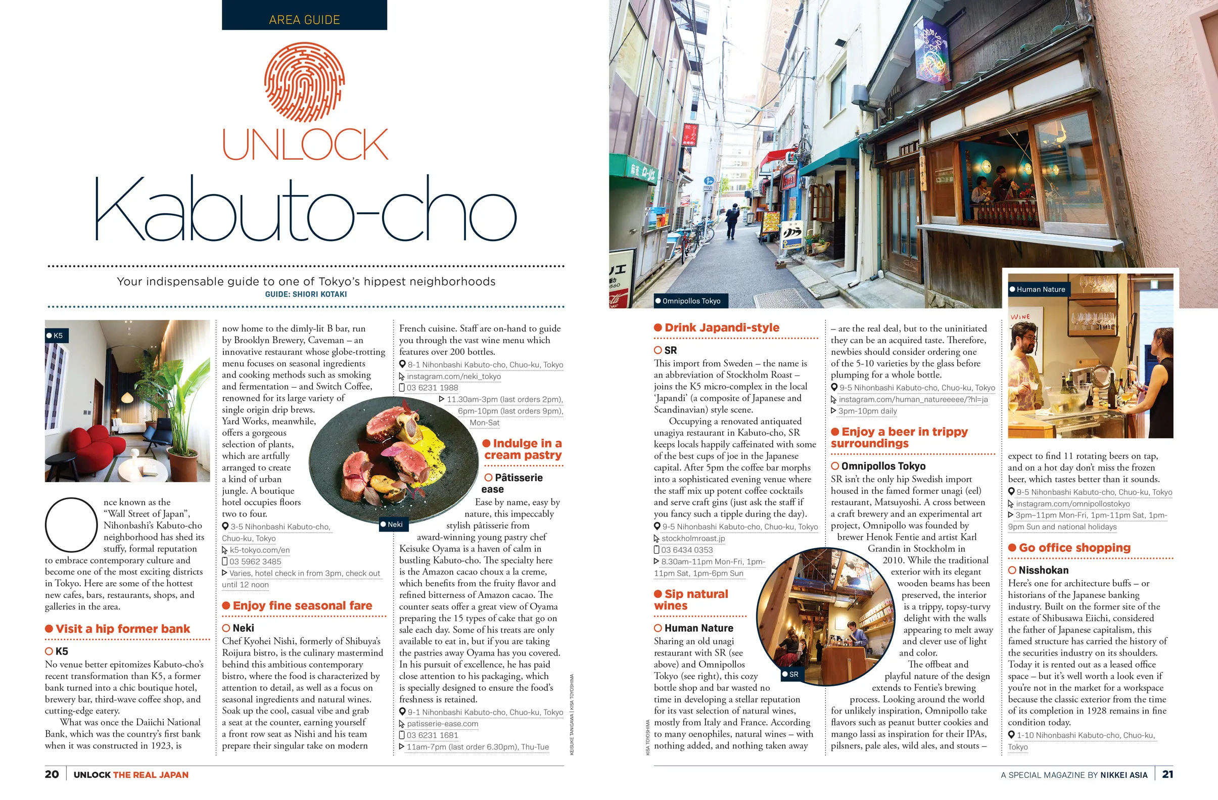 You’ll find a guide to Kabutocho (pictured above), which was chosen as one of the world’s 40 coolest neighbourhoods by Time Out readers around the globe. The former ‘Wall Street of Japan’ has transformed into a hip neighbourhood with art hotels and creative restaurants, all located in the Nihonbashi business district.