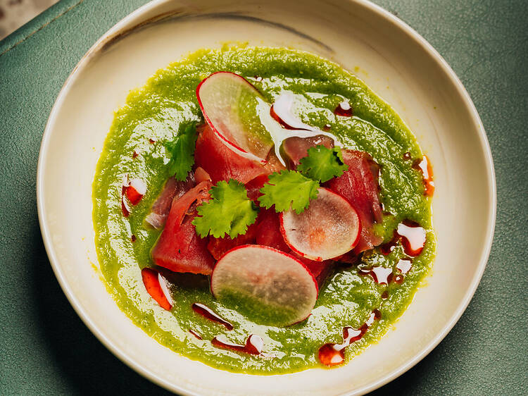 Served at Amelia’s 1931 in Miami, this Tuna Aguachile is a gluten-free tuna dish with compressed, fresh watermelon, and complemented with the chef’s signature aguachile sauce.