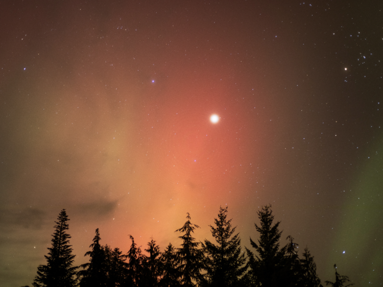 There’s a geomagnetic storm happening now, according to Space.com, with lots of solar eruptions and fast solar wind caused by several recent solar eruptions and streams of fast-moving solar wind. When these charged particles from the Sun collide with Earth’s magnetic field, they can create bright, colorful auroras that are visible much farther south than usual—making tonight an ideal time to catch the Northern Lights in these particular areas.
